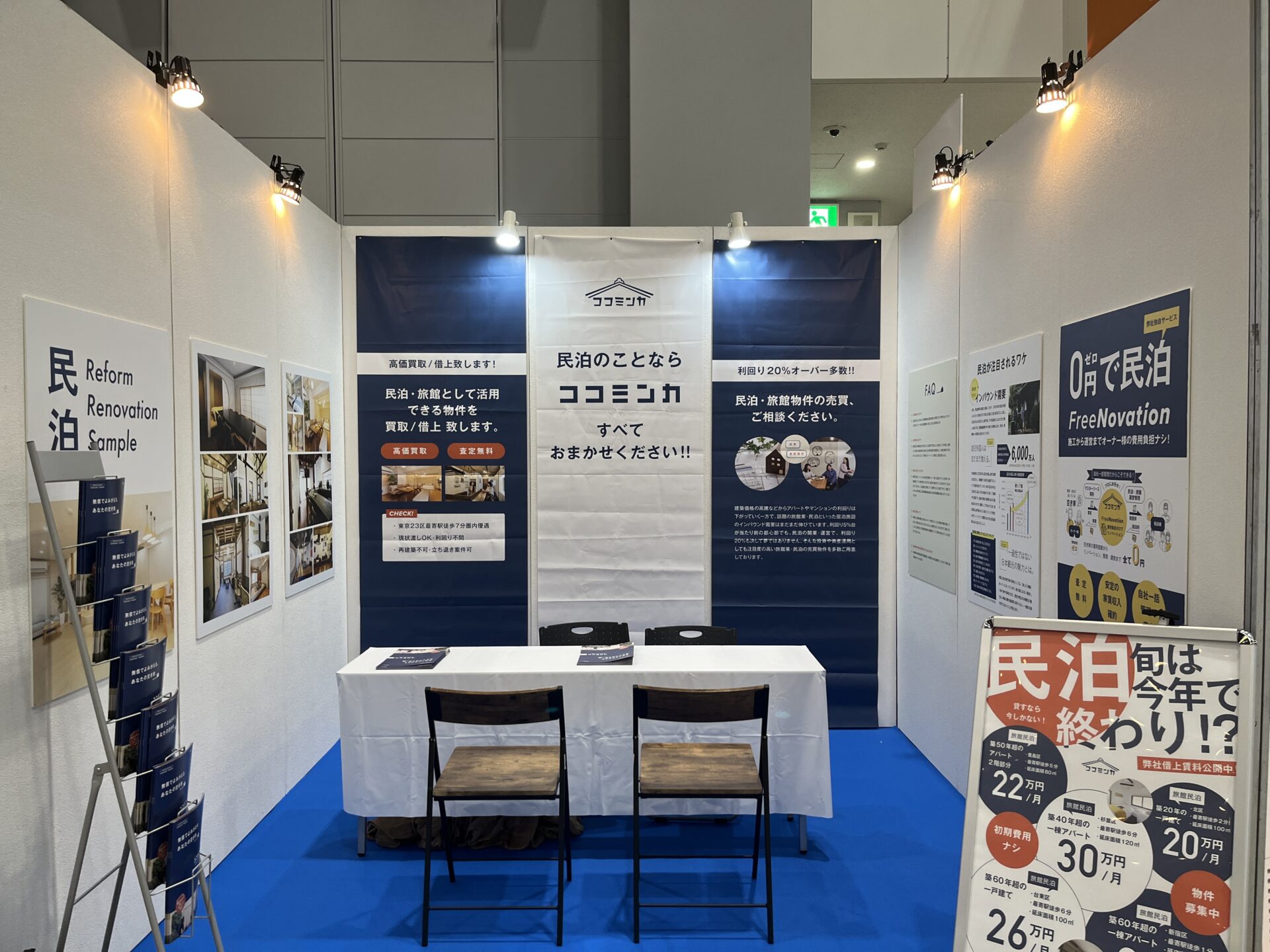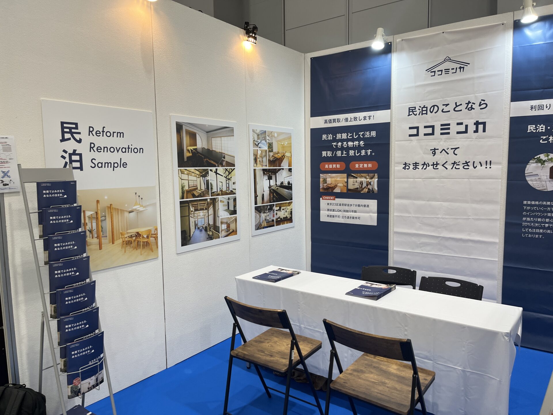 出展ブースにも多くのみなさまに足を運んでいただきありがとうございました。今回は特に民泊での空き家活用をメインに打ち出したブース作りに。代表のセミナー終了直後から、たくさんご来場いただいたこともあり、初日からいろいろな方のご相談やお悩みをお聞きできたことは、大変良い経験となりました。
