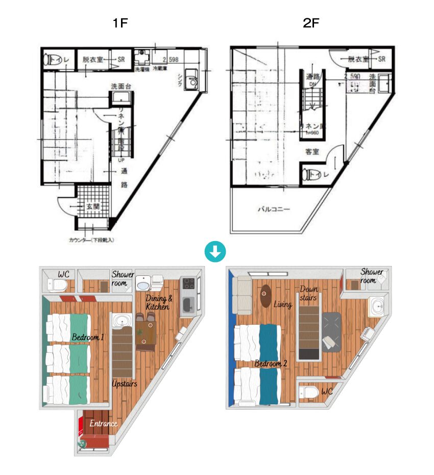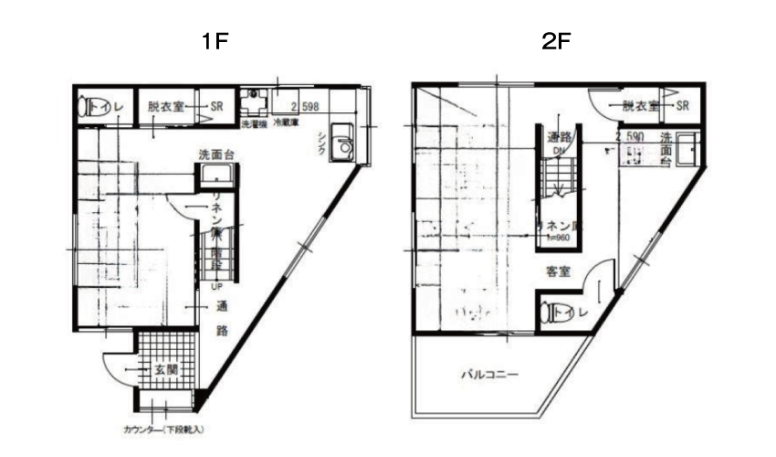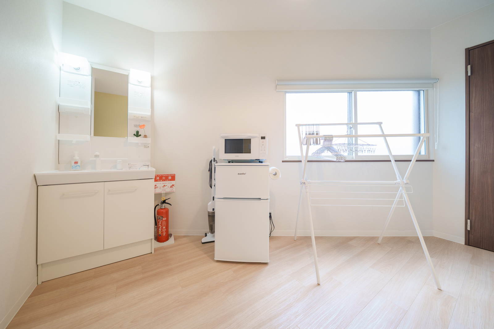 居室としては成立しにくかった空間に、滞在中の身支度や簡単な飲食準備、物干しといった生活機能を集約することで、民泊施設としての使い勝手を大きく向上させています。