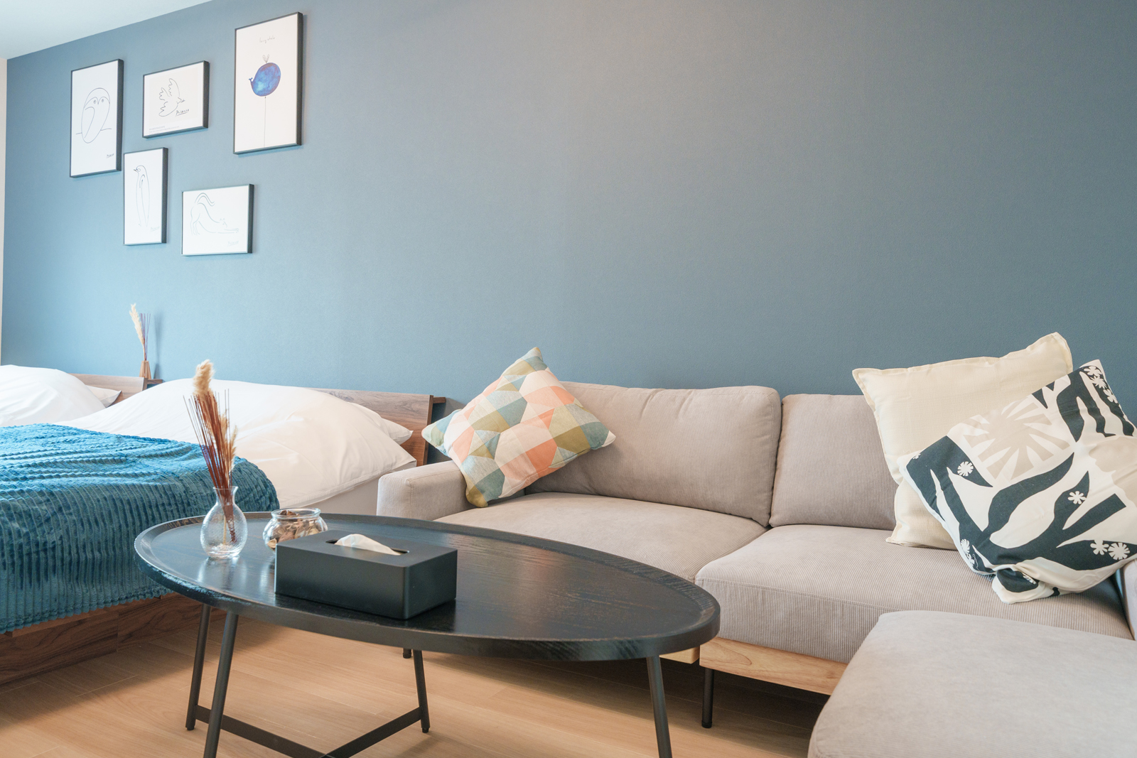 爽やかなブルーのアクセントが白と調和し、視覚的にも広がりを感じさせます。日中は自然光がやさしく差し込み、明るく軽やかな印象に。夜には照明と色味が重なり、静かに過ごせるリラックスした雰囲気へと表情を変えます。
