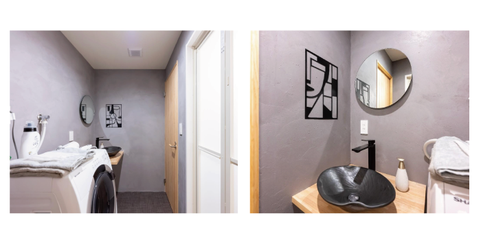 また、洗濯機などの必要な設備をしっかりと備えることで、観光やビジネスでの短期滞在はもちろん、連泊や長期滞在にも対応。デザイン性と実用性のバランスを兼ね備えたバスルームに仕上げました。