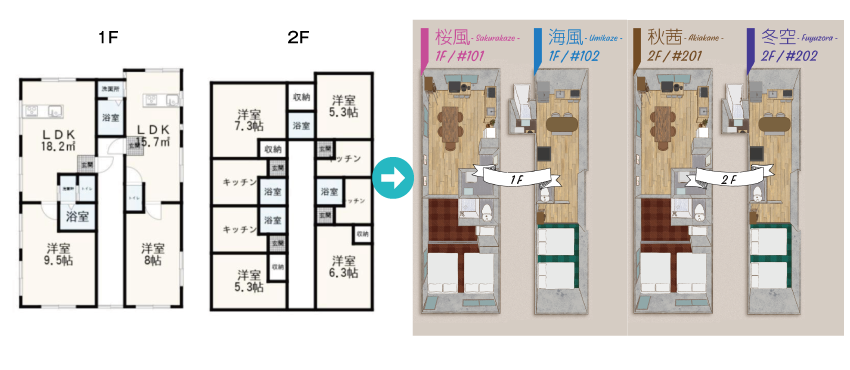 空室続きだった築古アパートが、立地を武器に民泊施設へ再生。「ふうろう Furo」